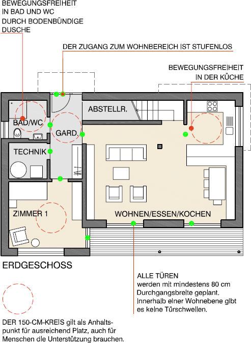 Barrierefreies Bauen bedeutet vorausschauend Planen und Bauen: Ob mit Gepäck und Taschen beladen, mit Kinderwagen, für Menschen mit Begleitung oder im Rollstuhl, kleine Hindernisse wie Schwellen, Stufen, enge Türen oder Gänge können oft und manchmal auch unerwartet schnell zur großen Herausforderung im Alltag werden.